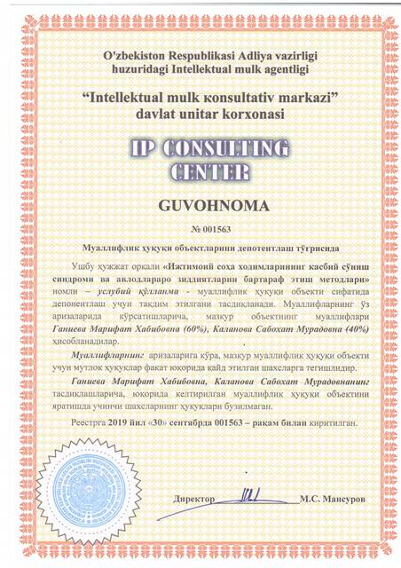 | 8625 | №001563 | Услубий қўлланма - "Ижтимоий соҳа ходимларининг касбий сўниш синдроми ва авлодлараро зиддиятларни бартараф этиш методлари" | Ганиева Марифат Хабибовна (60%), Каланова Сабохат Мурадовна (40%) | Ганиева Марифат Хабибовна, Каланова Сабохат Мурадовна | 09/30/2019 | ![]() |