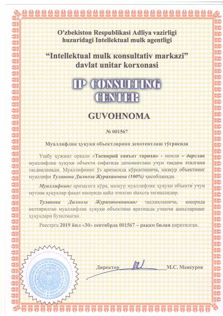 | 8621 | №001567 | Дарслик - " Тасвирий санъат тарихи " | Туланова Дилноза Журахановна (100%) | Туланова Дилноза Журахановна | 09/30/2019 | ![]() |