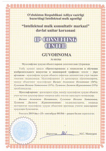 | 8622 | №001566 | Ўқув қўлланма - "Проектирование и технологии в обучении изобразительного искусства и инженерной графики" | Валиев Аъзамжон Нематович (34%), Гуломова Нозима Хотамовна (33%), Туланова Дилноза Журахановна (33%) | Валиев Аъзамжон Нематович, Гуломова Нозима Хотамовна, Туланова Дилноза Журахановна | 09/25/2019 | ![]() |