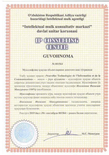 | 8624 | №001564 | Ўқув қўлланма - "Nouvelles Technologies de l’Information et de la Communication" | Иногамова Фазилат Мансуровна (100%) | Иногамова Фазилат Мансуровна | 09/30/2019 | ![]() |