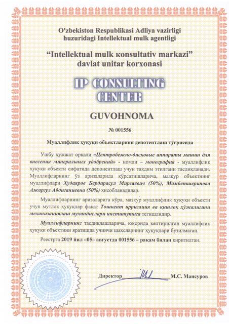 | 8632 | №001556 | Мнография - "Центробежно-дисковые аппараты машин для внесения минеральных удобрений" | Худаяров Бердирасул Мирзаевич (50%), Мамбетшерипова Ажаргул Абдиганиевна (50%) | Тошкент ирригация ва қишлоқ ҳўжалигини механизациялаш мухандислари институти | 08/05/2019 | ![]() |