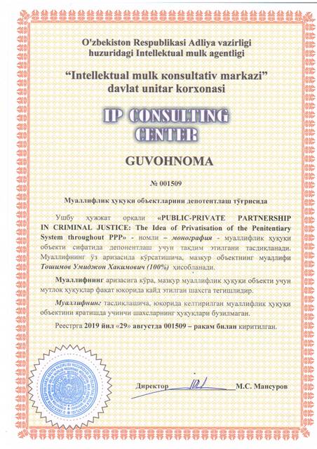 | 8679 | №001509 | Монография - "PUBLIC-PRIVATE PARTNERSHIP IN CRIMINAL JUSTICE: The Idea of Privatisation of the Penitentiary System throughout PPP" | Тошимов Умиджон Хакимович (100%) | Тошимов Умиджон Хакимович | 08/29/2019 | ![]() |