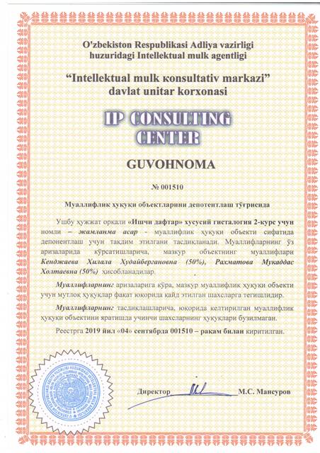 | 8678 | №001510 | Жамланма асар - "Ишчи дафтар" хусусий гисталогия 2-курс учун | Кенджаева Хилала Худайбергановна (50%), Рахматова Мукаддас Холтаевна (50%) | Кенджаева Хилала Худайбергановна, Рахматова Мукаддас Холтаевна | 09/04/2019 | ![]() |