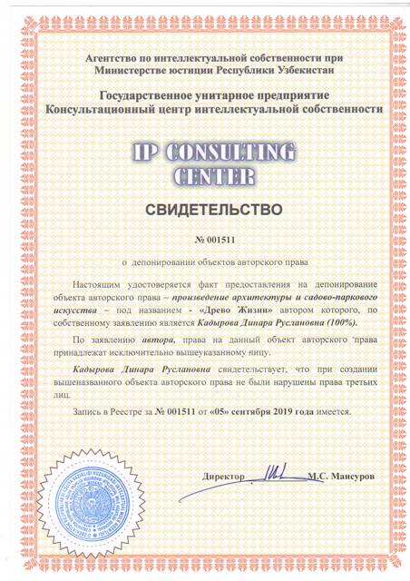 | 8677 | №001511 | Произведение архитектуры и садового - паркового искусства - "Древо Жизни" | Кадырова Динара Руслановна (100%) | Кадырова Динара Руслановна | 09/05/2019 | ![]() |