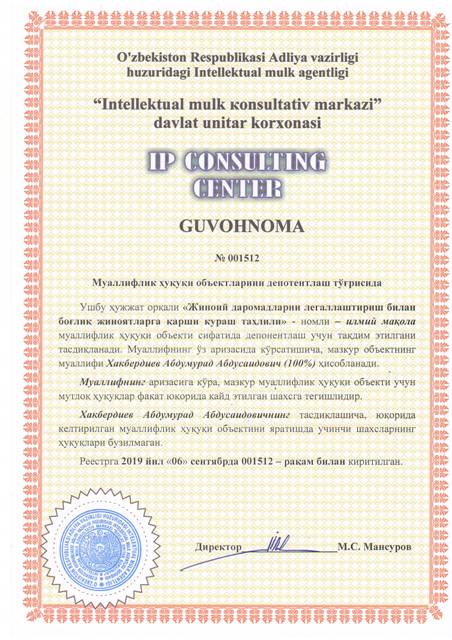 | 8676 | №001512 | Илмий мақола - "Жиноий даромадларни легаллаштириш билан боғлиқ жиноятларга қарши кураш таҳлили" | Хакбердиев Абдумурад Абдусаидович (100%) | Хакбердиев Абдумурад Абдусаидович | 09/06/2019 | ![]() |