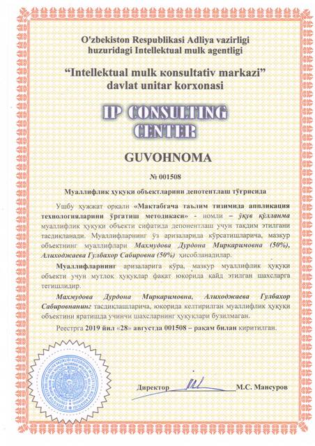 | 8680 | №001508 | Ўқув қўлланма - "Мактабгача таълим тизимида аппликация технологияларини ўргатиш методикаси" | Махмудова Дурдона Миркаримовна (50%), Алиходжаева Гулбахор Сабировна (50%) | Махмудова Дурдона Миркаримовна, Алиходжаева Гулбахор Сабировна | 08/28/2019 | ![]() |