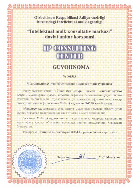 | 8675 | №001513 | Матнли мусиқа асари - "Ўшал кун келур" | Усманов Хаёт Джураевич (100%) | Усманов Хаёт Джураевич | 09/10/2019 | ![]() |