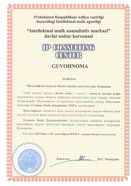 | 8674 | №001514 | Матнли мусиқа асари - "Ketar edim" | Усманов Хаёт Джураевич (100%) | Усманов Хаёт Джураевич | 09/10/2019 | ![]() |