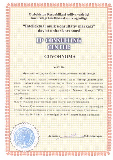 | 8672 | №001516 | Илмий асар - "Жисмларнинг ўзаро таъсир динамикаси" | Тилесов Кучкар (100%) | Тилесов Кучкар | 09/10/2019 | ![]() |