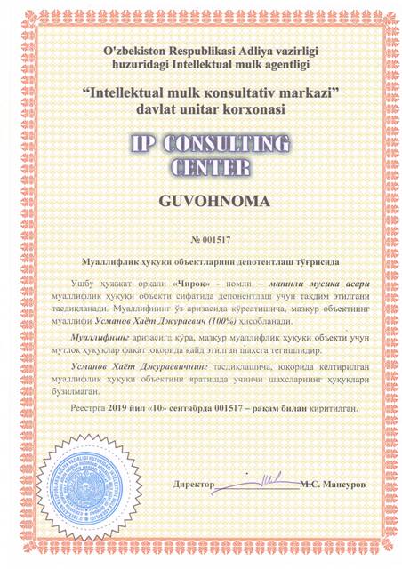 | 8671 | №001517 | Матнли мусиқа асари - "Чироқ" | Усманов Хаёт Джураевич (100%) | Усманов Хаёт Джураевич | 09/10/2019 | ![]() |