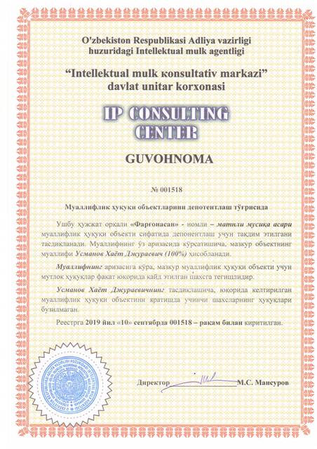 | 8670 | №001518 | Матнли мусиқа асари - "Фарғонасан" | Усманов Хаёт Джураевич (100%) | Усманов Хаёт Джураевич | 09/10/2019 | ![]() |