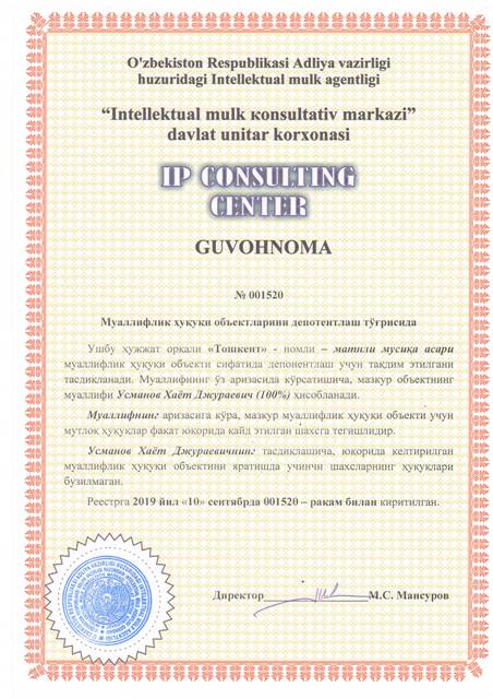 | 8668 | №001520 | Матнли мусиқа асари - "Тошкент" | Усманов Хаёт Джураевич (100%) | Усманов Хаёт Джураевич | 09/10/2019 | ![]() |