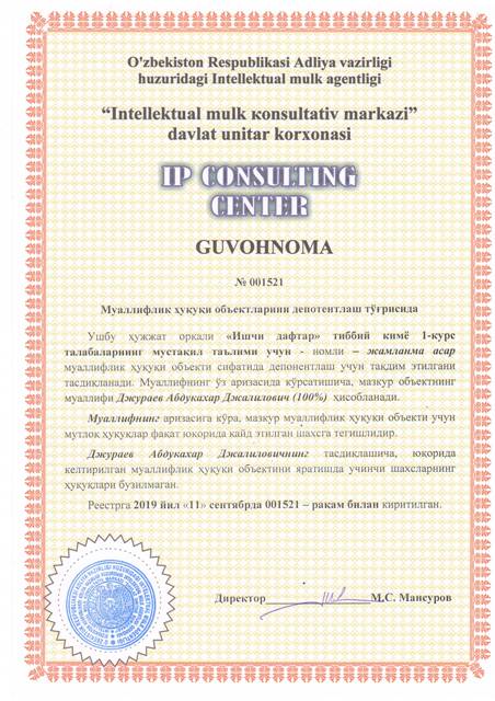 | 8667 | №001521 | Жамланма асар - "Ишчи дафтар" тиббий кимё 1-курс талабаларнинг мустақил таълими учун | Джураев Абдукахар Джалилович (100%) | Джураев Абдукахар Джалилович | 09/11/2019 | ![]() |