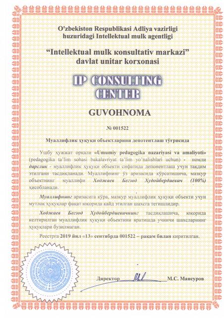 | 8666 | №001522 | Дарслик - "Umumiy pedagogika nazariyasi va amaliyoti" (pedagogika ta’lim sohasi bakalavriyat ta’lim yo’nalishlari uchun) | Ходжаев Бегзод Худойбердиевич (100%) | Ходжаев Бегзод Худойбердиевич | 09/13/2019 | ![]() |