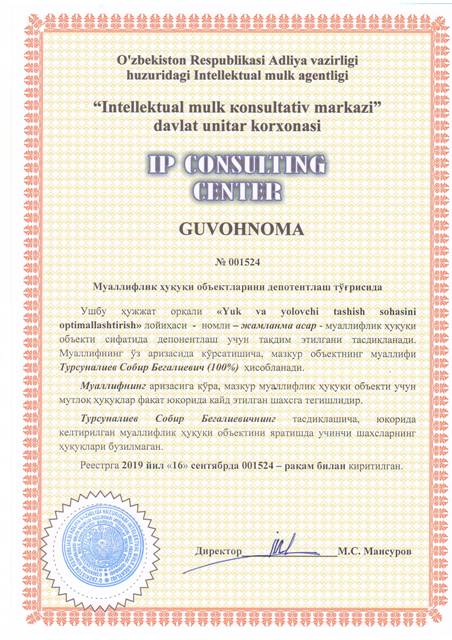 | 8664 | №001524 | Жамланма асар - " Yuk va yolovchi tashish sohasini optimallashtirish" лойиҳаси | Турсуналиев Собир Бегалиевич (100%) | Турсуналиев Собир Бегалиевич | 09/16/2019 | ![]() |