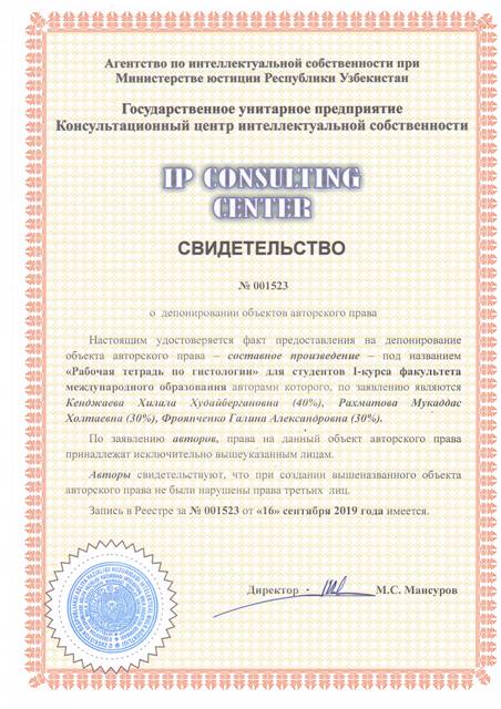 | 8665 | №001523 | Составное произведение – "Рабочая тетрадь по гистологии" для студентов I-курса факультета международного образования | Кенджаева Хилала Худайбергановна (40%), Рахматова Мукаддас Холтаевна (30%), Фроянченко Галина Александровна (30%) | Кенджаева Хилала Худайбергановна, Рахматова Мукаддас Холтаевна, Фроянченко Галина Александровна | 09/16/2019 | ![]() |