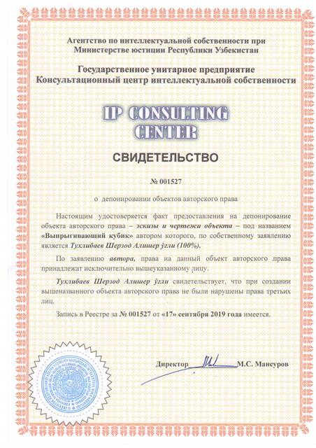 | 8661 | №001527 | Эскизы и чертежи объекта – "Выпрыгивающий кубик" | Тухлибаев Шерзод Алишер ўғли (100%) | Тухлибаев Шерзод Алишер ўғли | 09/17/2019 | ![]() |