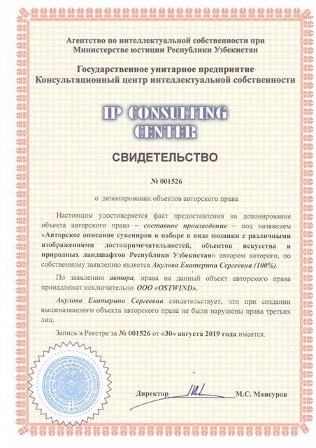 | 8662 | №001526 | Составное произведение – "Авторское описание сувениров в наборе в виде мозаики с различными изображениями достопримечательностей, объектов искусства и природных ландшафтов Республики Узбекистан" | Акулова Екатерина Сергеевна (100%) | ООО "OSTWIND" | 08/30/2019 | ![]() |