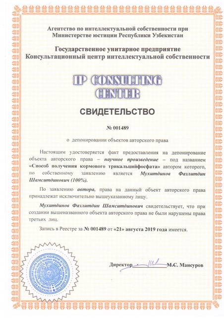| 8699 | №001489 | Научное произведение – "Способ получения кормового трикальцийфосфата" | Мухитдинов Фазлитдин Шамситдинович (100%) | Мухитдинов Фазлитдин Шамситдинович | 08/21/2019 | ![]() |