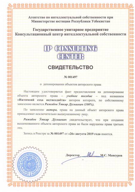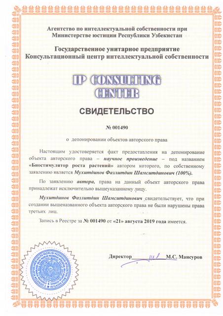 | 8698 | №001490 | Научное произведение – "Биостимулятор роста растений" | Мухитдинов Фазлитдин Шамситдинович (100%) | Мухитдинов Фазлитдин Шамситдинович | 08/21/2019 | ![]() |