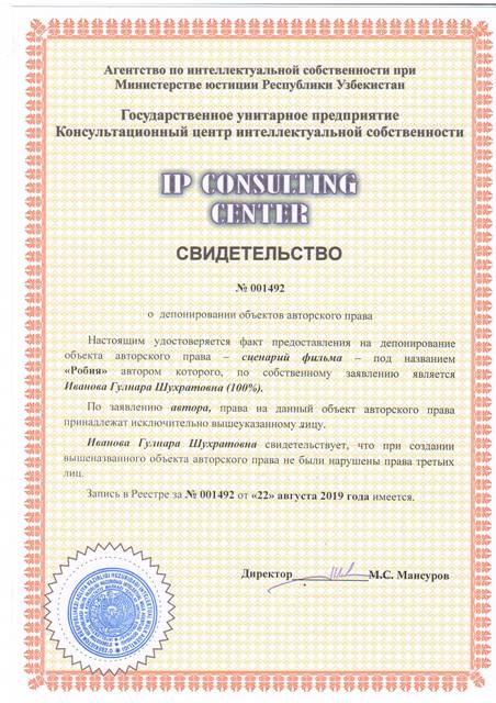 | 8696 | №001492 | Сценарий фильма - "Робия" | Иванова Гулнара Шухратовна (100%) | Иванова Гулнара Шухратовна | 08/22/2019 | ![]() |