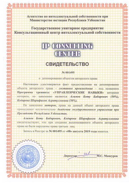 | 8693 | №001495 | Составное произведение – Программа тренинга: "УПРАВЛЕНЧЕСКИЕ НАВЫКИ" | Алимов Боту Бабирович (50%), Кодирова Шарифахон Асратуллоевна (50%) | Академия государственного управления при Президенте Республики Узбекистан | 08/08/2019 | ![]() |