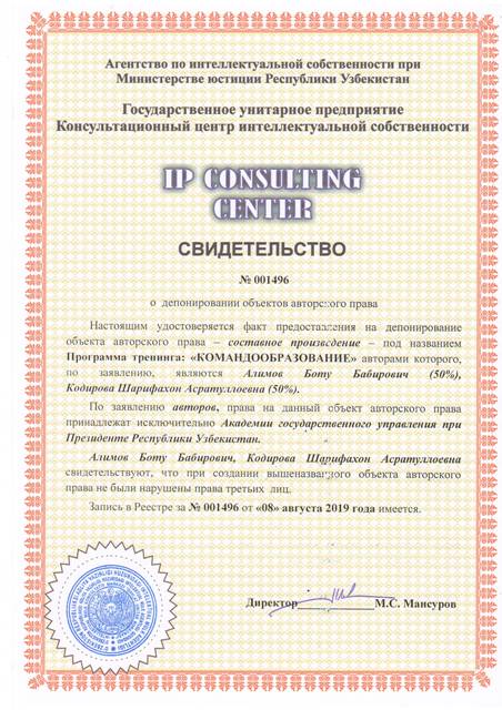 | 8692 | №001496 | Составное произведение – Программа тренинга: "КОМАНДООБРАЗОВАНИЕ" | Алимов Боту Бабирович (50%), Кодирова Шарифахон Асратуллоевна (50%) | Академия государственного управления при Президенте Республики Узбекистан | 08/08/2019 | ![]() |