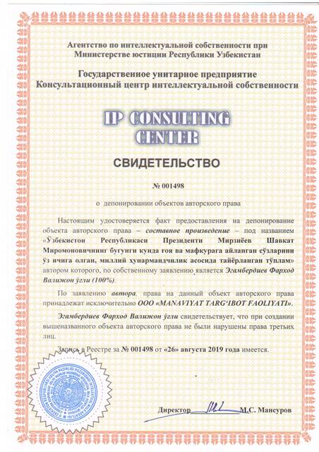 | 8690 | №001498 | Составное произведение – Ўзбекистон Республикаси Президенти Мирзиёев Шавкат Миромоновичнинг бугунги кунда ғоя ва мафкурага айланган сўзларини ўз ичига олган, миллий ҳунармандчилик асосида тайёрланган тўплам" | Эгамбердиев Фарход Валижон ўғли (100%) | ООО «MANAVIYAT TARG‘IBOT FAOLIYATI» | 08/26/2019 | ![]() |