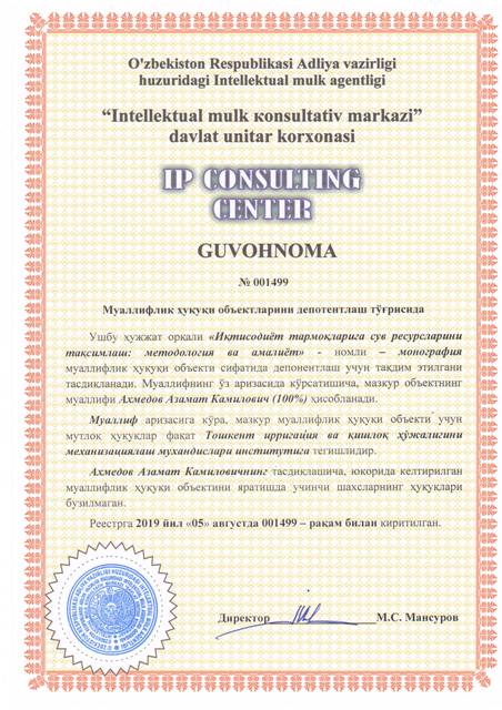 | 8689 | №001499 | Монография - "Иқтисодиёт тармоқларига сув ресурсларини тақсимлаш: методология ва амалиёт" | Ахмедов Азамат Камилович (100%) | Тошкент ирригация ва қишлоқ ҳўжалигини механизациялаш мухандислари институти | 08/05/2019 | ![]() |