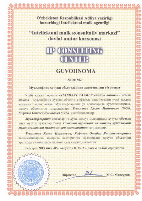 | 8686 | №001502 | Мақола - "STANDART TAYMER electron dasturi" | Туркменов Хасан Ишимович (70%), Хафизов Отабек Яшинович (30%) | Тошкент ирригация ва қишлоқ ҳўжалигини механизациялаш мухандислари институти | 08/05/2019 | ![]() |