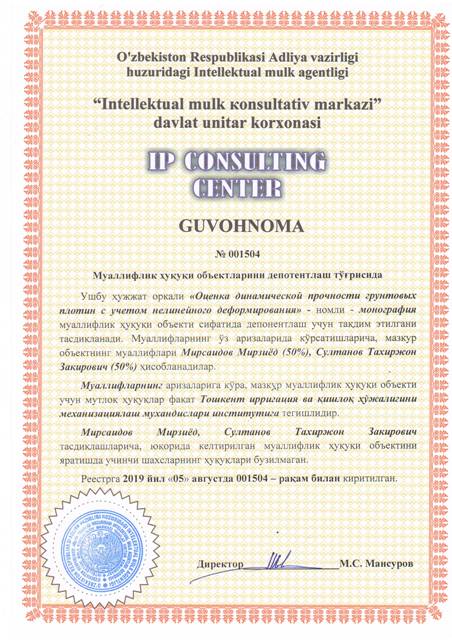 | 8684 | №001504 | Мнография - Оценка динамической прочности грунтовых плотин с учетом нелинейного деформирования | Мирсаидов Мирзиёд (50%), Султанов Тахиржон Закирович (50%) | Тошкент ирригация ва қишлоқ ҳўжалигини механизациялаш мухандислари институти | 08/05/2019 | ![]() |