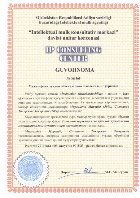 | 8683 | №001505 | Ўқув қўлланма - "Inshootlar zilzilabardoshligi" | Мирсаидов Мирзиёд (50%), Султанов Тахиржон Закирович (50%) | Тошкент ирригация ва қишлоқ ҳўжалигини механизациялаш мухандислари институти | 08/05/2019 | ![]() |