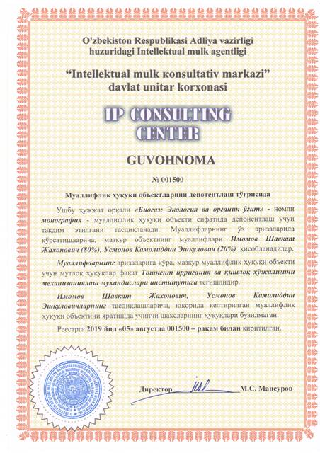 | 8688 | №001500 | Мнография - "Биогаз: Экология ва органик ўғит" | Имомов Шавкат Жахонович (80%), Усмонов Камолиддин Эшкулович (20%) | Тошкент ирригация ва қишлоқ ҳўжалигини механизациялаш мухандислари институти | 08/05/2019 | ![]() |