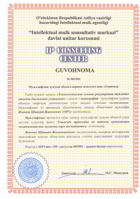 | 8687 | №001501 | Мнография - "Технологические основы рекуперации тепловых отходов биогазовых установок" | Имомов Шавкат Жахонович (100%) | Тошкент ирригация ва қишлоқ ҳўжалигини механизациялаш мухандислари институти | 08/05/2019 | ![]() |