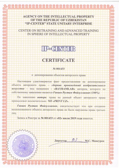 | 8755 | №001433 | Сборник произведений изобразительного искусства – "BAYRAMLAR" | Ғаниев Рустам Файзуллаевич (100%) | ЧП «PRINT UZ» | 07/02/2019 | ![]() |