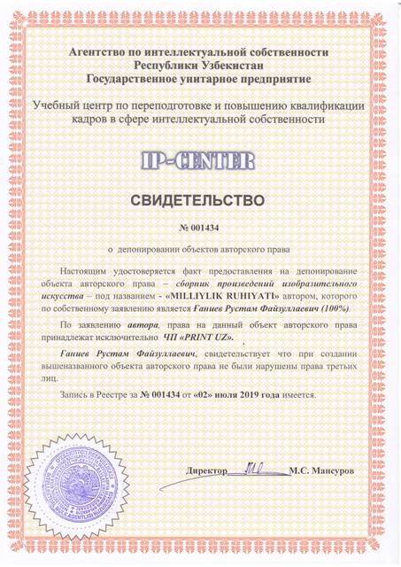 | 8754 | №001434 | Сборник произведений изобразительного искусства – "MILLIYLIK RUHIYATI" | Ғаниев Рустам Файзуллаевич (100%) | ЧП «PRINT UZ» | 07/02/2019 | ![]() |