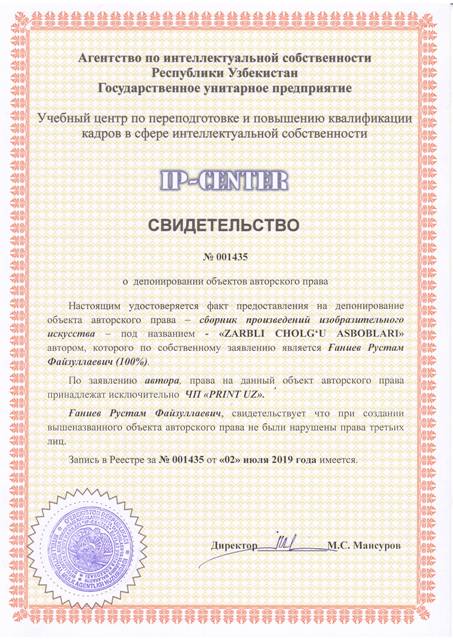 | 8753 | №001435 | Сборник произведений изобразительного искусства – "ZARBLI CHOLG‘U ASBOBLARI" | Ғаниев Рустам Файзуллаевич (100%) | ЧП «PRINT UZ» | 07/02/2019 | ![]() |