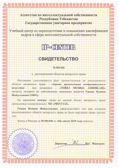| 8752 | №001436 | Сборник произведений изобразительного искусства – "TORLI MUSIQA CHOLG‘U ASBOBLARI" | Ғаниев Рустам Файзуллаевич (100%) | ЧП «PRINT UZ» | 07/02/2019 | ![]() |
