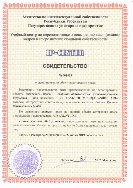 | 8750 | №001438 | Сборник произведений изобразительного искусства – "PUFLAGICH MUSIQA ASBOBLARI" | Ғаниев Рустам Файзуллаевич (100%) | ЧП «PRINT UZ» | 07/02/2019 | ![]() |