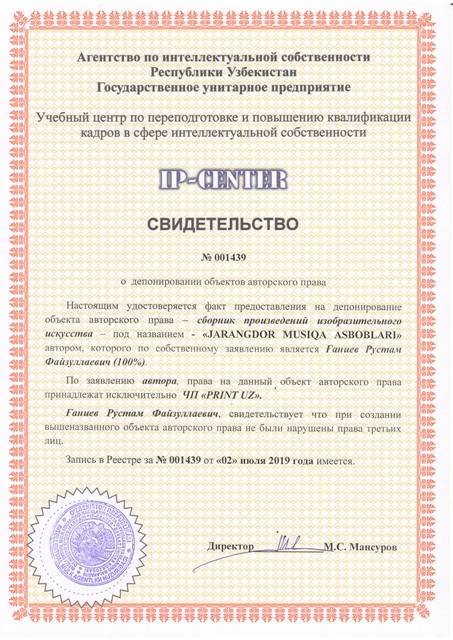 | 8749 | №001439 | Сборник произведений изобразительного искусства – "JARANGDOR MUSIQA ASBOBLARI" | Ғаниев Рустам Файзуллаевич (100%) | ЧП «PRINT UZ» | 07/02/2019 | ![]() |