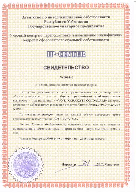 | 8748 | №001440 | Сборник произведений изобразительного искусства – "YO‘L XARAKATI QOIDALARI" | Ғаниев Рустам Файзуллаевич (100%) | ЧП «PRINT UZ» | 07/02/2019 | ![]() |