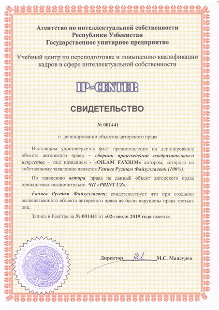 | 8747 | №001441 | Сборник произведений изобразительного искусства – "OILAM FAXRIM" | Ғаниев Рустам Файзуллаевич (100%) | ЧП «PRINT UZ» | 07/02/2019 | ![]() |