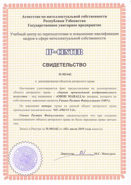 | 8746 | №001442 | Сборник произведений изобразительного искусства – "OBOD MAHALLA" | Ғаниев Рустам Файзуллаевич (100%) | ЧП «PRINT UZ» | 07/02/2019 | ![]() |