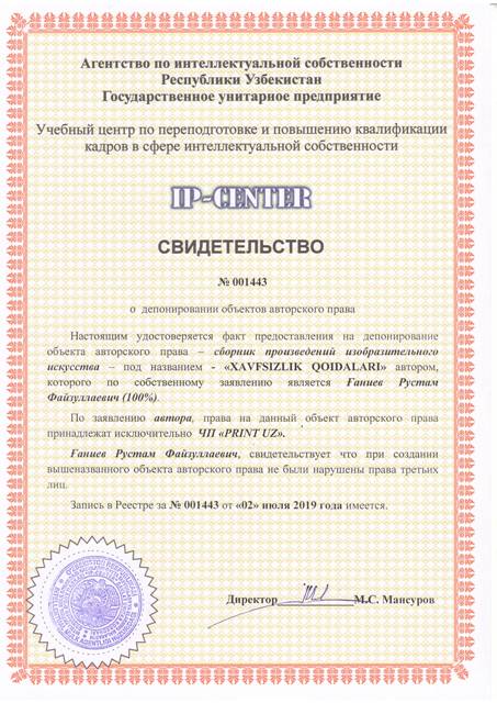 | 8745 | №001443 | Сборник произведений изобразительного искусства – "XAVFSIZLIK QOIDALARI" | Ғаниев Рустам Файзуллаевич (100%) | ЧП «PRINT UZ» | 07/02/2019 | ![]() |