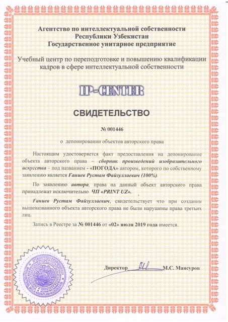 | 8742 | №001446 | Сборник произведений изобразительного искусства – "ПОГОДА" | Ғаниев Рустам Файзуллаевич (100%) | ЧП «PRINT UZ» | 07/02/2019 | ![]() |