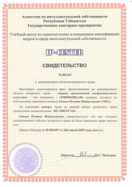 | 8741 | №001447 | Сборник произведений изобразительного искусства – "FIDOKORLAR" | Ғаниев Рустам Файзуллаевич (100%) | ЧП «PRINT UZ» | 07/02/2019 | ![]() |