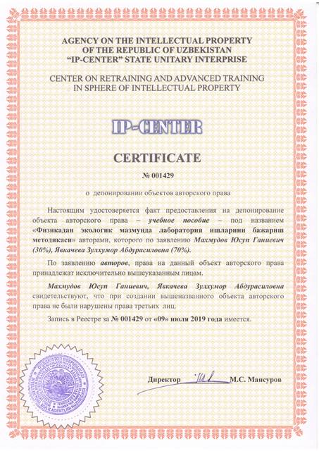 | 8759 | №001429 | Учебное пособие – "Физикадан экологик мазмунда лаборатория ишларини бажариш методикаси" | Махмудов Юсуп Ганиевич (30%), Явкачева Зулхумор Абдурасиловна (70%) | Махмудов Юсуп Ганиевич, Явкачева Зулхумор Абдурасиловна | 07/09/2019 | ![]() |