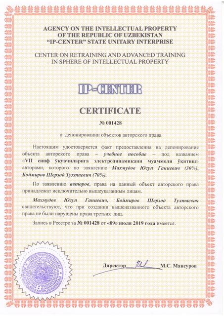 | 8760 | №001428 | Учебное пособие – "VII синф ўқувчиларига электродинамикани муаммоли ўқитиш" | Махмудов Юсуп Ганиевич (30%), Боймиров Шерзод Тухтаевич (70%) | Махмудов Юсуп Ганиевич, Боймиров Шерзод Тухтаевич | 07/09/2019 | ![]() |