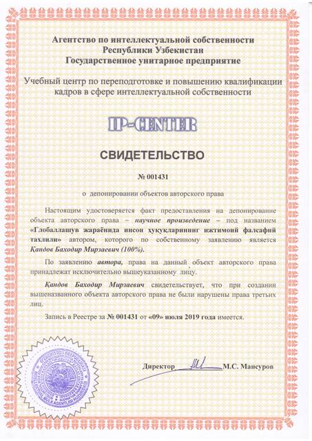 | 8757 | №001431 | Научное произведение – "Глобаллашув жараёнида инсон ҳуқуқларининг ижтимоий фалсафий тахлили" | Қандов Баходир Мирзаевич (100%) | Қандов Баходир Мирзаевич | 07/09/2019 | ![]() |