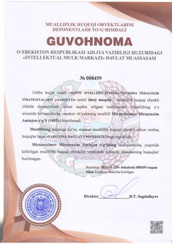 878 | №008459 | Ilmiy maqola – "SUN’IY INTELLEKT INTEGRATSIYASIDA PEDAGOGIK STRATEGIYALARNI AXAMIYATI" | Mirzaraximov Mirzaraxim Aminjon o‘g‘li (100%) | FARG‘ONA DAVLAT UNIVERSITETI | 12/25/2024 | ![]() |